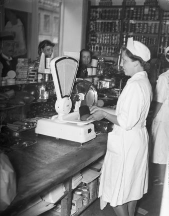 Brödransonering under andra världskriget. Kvinna i vit rock i mataffär väger bröd på en våg åt kunder.