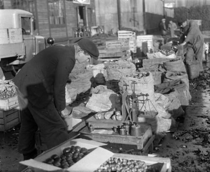 Handel med grönsaker och rotfrukter utanför Saluhallen vid Klara Strand.