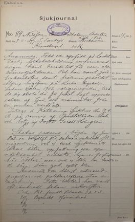Anamnes. Född och uppfödd på landet. Vanlig folkskolebildning, confirmerad, ingen känd heriditet för nerv- eller sinnessjukdomar. Pat. har varit jordbruksarbetare samt frälsningssoldat. Aldrig begiven på starka drycker.