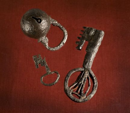 Bilden visar två par nycklar och ett litet kullås, ett runt hänglås från medeltiden.
