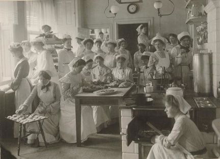 Odaterad bild med personal från Landelius konditori. Fotot är taget på Elisabeth Östmans hushållsskola, vilken låg på tidigare Jakobsbergsgatan 34 i kvarteret Hammaren.