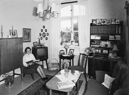 Borgerskapets änkehus, Norrtullsgatan 45. Interiör från lägenhet. Fru Wiklund sitter vid TVapparaten.