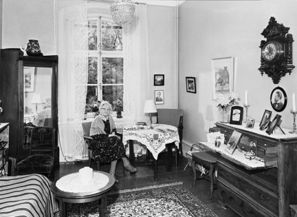 Borgerskapets änkehus, Norrtullsgatan 45. Interiör från ett rum där en äldre kvinna bor.