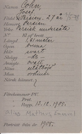 1905 arresteras Josef Cohn för lösdriveri i Falkenberg. Han skickas därefter upp till Stockholm för att låta huvudstadens Överståthållareämbete utreda fallet noggrannare. I en polisrapport kan vi läsa hur Cohn berättar om sin bakgrund i Persien.