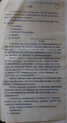 1915 finns en oro att bli av med personal på Stockholmspolisens detektiva avdelning. I det här PM:et argumenterar avdelningens chef, Gustaf Lidberg, för att ingen av hans anställda ska tas ut till krigstjänst. Förutom brottsutredningar, hade avdelningen även ansvara för att övervaka utlänningar i staden.