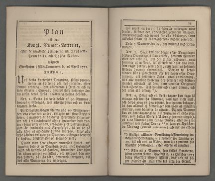 I detta dokument förkunnas det att man har för avsikt att inrätta ett nummerlotteri efter modell från kontinenten, ett så kallat genuesiskt lotteri. Här står det vilka regler som ska gälla för lotteriet. Bland annat: "sedan att man flere gånger omwridit hjulet, uttages en lott af en barnhusgosse med förbundne ögon och handske på handen"...