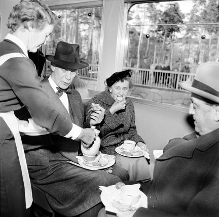 Den 19 november är det åter dags att förlänga tunnelbanan. Invigningen ägde rum dagen innan vid Bagarmossens station, sedan bar det iväg till Farsta och Hässelby Strand med dekorerat invigningståg med 300 gäster och kaffeservering ombord. Överståthållaren Johan Hagander, spårvägsstyrelseledamoten Vera Söderström och Vd Hans von Heland firar invigningen med kaffe.