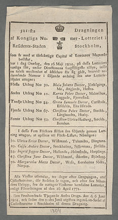 Här kan vi läsa oss till vilka fem flickor det var som hade turen på sin sida denna vårdag 1804. Bland dessa nämns en "stockholmska", nämligen Christina Ulrica Hedberg från Allmänna barnhuset i Stockholm.