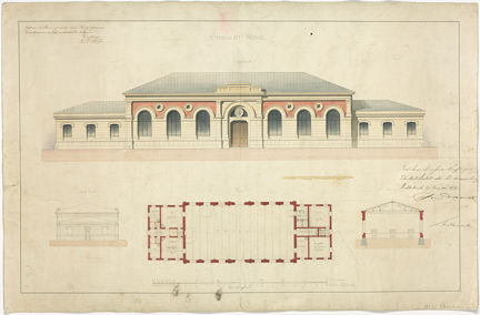 ”Ritning till nytt packhus” signerad av arkitekt Axel Fredrik Nyström år 1874. Tullpackhuset på Blasieholmen ritades av Nyström, det uppfördes av Tullverket och Stockholms stad stod för ekonomin. Huset var färdigbyggt 1876.