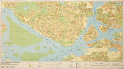 Kartblad ”42 Västerled” ur Officiella Stockholmskartan. Upprättad och ritad vid Stockholms stadsingenjörskontor. Litograferad och tryckt vid Generalstabens litografiska anstalt, Stockholm 1954. Skala 1:10 000.