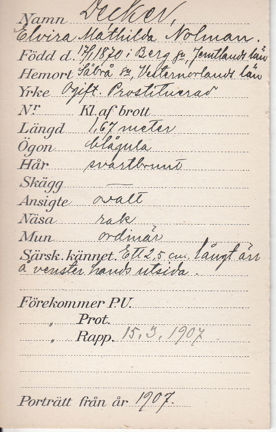 Polisfotografiet av Elvira Matilda Decker är taget 1907. Den 28 maj det året hade polisen häktat henne för ”lösdriveri” – hemlöshet. I samband med häktningen fotograferades hon. Elvira dömdes till sex månaders tvångsarbete eftersom det var olagligt att vara hemlös.