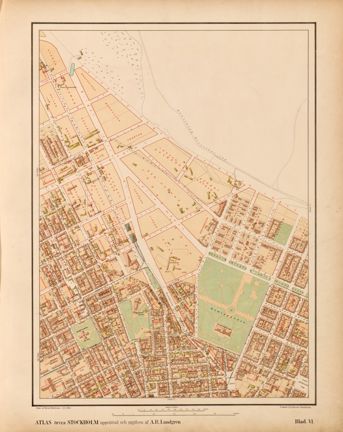 Kartblad 6 ur Atlas öfver Stockholm upprättad och utgifven af A. R. Lundgren år 1885. Bladet visar delar av Norrmalm, Östermalm och Norra Djurgården.