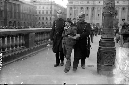 Två poliser på Norrbro håller den ryske medborgaren Josef Skoutelsky mellan sig i ett fast grepp.