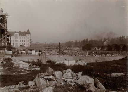 Axel Lagrelius, chef för Generalstabens litografiska anstalt 1898-1933, har lämnat efter sig en serie fotografier från byggnationen av huset Trädlärkan 9, Sköldungatan 3. Lagrelius och hans familj flyttade in i huset när det var färdigställt 1910. Här har huset inte riktigt börjat byggas än, utan tomten är tom. Det vita palatsliknande huset i fonden är fastigheten Trasten 14 i korsningen Odengatan/Valhallavägen.