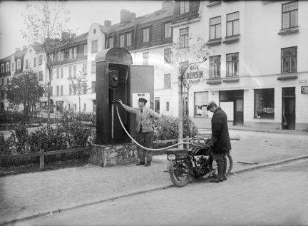 Mack bensinpump vid Julikullen. I bakgrunden Aprilgatan i kvarteret Silverpoppeln.