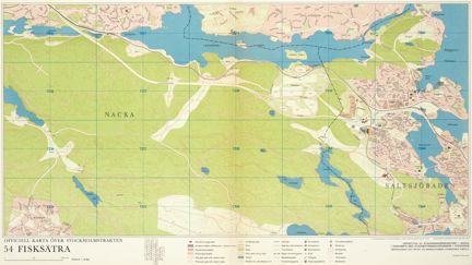 Kartblad ”54 Fisksätra” ur Officiell karta över Stockholmstrakten år 1970. Upprättad av Stadsingenjörskontoret i Nacka i samarbete med Stadsmätningsavdelningen i Stockholm. Reproducerad och tryckt vid Generalstabens litografiska anstalt. Skala 1:10 000.