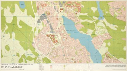 Kartblad ”12 Järvafältet" ur Officiell karta över Stockholmstrakten år 1972. Upprättad av Stadsmätningsavdelningen i Stockholm. Reproducerad och tryckt vid Generalstabens litografiska anstalt. Skala 1:10 000.