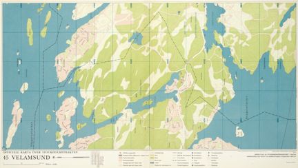 Kartblad ”Velamsund" ur Officiell karta över Stockholmstrakten år 1972. Upprättad av Stadsingenjörskontoret i Nacka. Reproducerad och tryckt vid Generalstabens litografiska anstalt. Skala 1:10 000