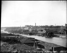 I målningen ser vi ett myller av händelser. Det är byggnader, båtar och skorstenar, människor som bär saker, människor som går in och ut ur en byggnad och människor som skyfflar något i högar. I förgrunden ryker det från glödande kol och porslin ligger utströdd på marken. Alla lampor är tända i fabriken.