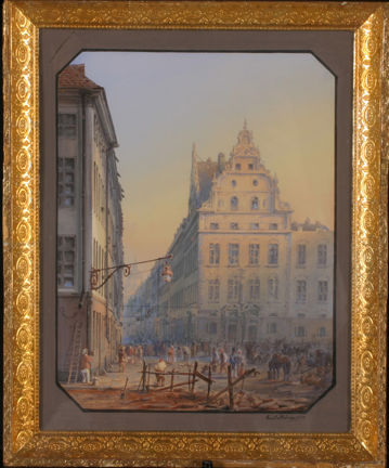 I mitten av 1800-talet var Munkbron en plats för torghandel. Längs med hela kajen till Riddarholmskanalen satte handlare upp sina handelsstånd. Här ser vi inga stånd, förmodligen för att timmen är sen och handlare är i färd med att packa ihop. Aftonljuset färgar fasaden gul. I förgrunden är det en byggarbetsplats. Det är Stockholms stad som lägger ny gatubeläggning i sten, ett omfattande arbete i mitten av 1800-talet.