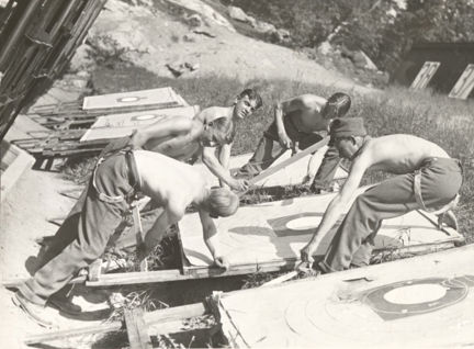 På bilden monterar några unga pojkar målskjutningstavlor vid Kaknäs på Djurgården.
