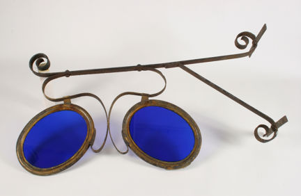 Skylt som troligtvis har hängt utanför en optikers eller glasögonförsäljares butik. Skylten är i form av en binokel eller pincené, en typ av glasögon som hålls fast med en klämam över näsryggen. Binoklen har blåa ögonglas och guldbronserade järnbågar. Hela skylten hänger i en järnställning.
