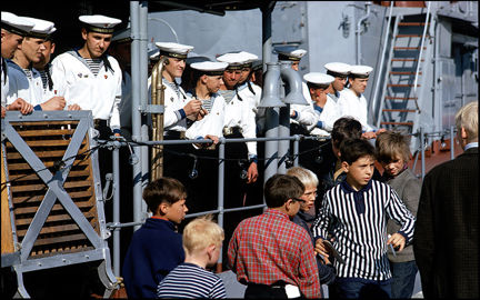 Stadsgården, ryska sjömän tittar på grabbar med autografblock på kajen