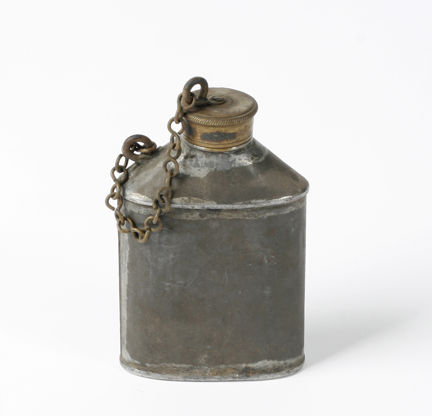 Oljeflaska av plåt. Lock av mässing, vilket sitter fast med en kedja.