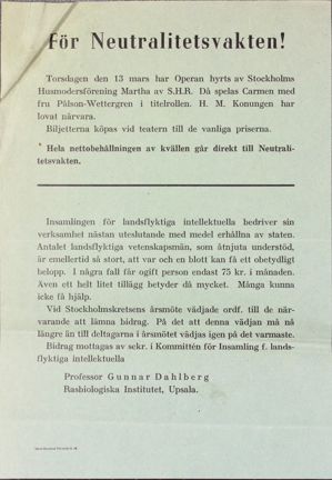 I samma pamflett vädjade man om bidrag till landsflyktiga vetenskapsmän och intellektuella. Insamlingen ordnades av Gunnar Dahlberg, sekreterare i ”Kommittén för Insamling för landsflyktiga intellektuella”. Gunnar Dahlberg var också chef för rasbiologiska institutet i Uppsala från 1935. Till skillnad från sin föregångare, Herman Lundborg, var han motståndare till nazismen.