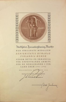 Stockholms Husmodersförening Martha bidrog mycket till Finlandshjälpen under andra världskriget. Som tack fick man motta en medalj och ett diplom undertecknat av Finlands premiärminister och socialminister.