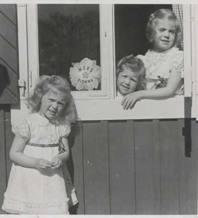 Fotografiet visar Hagasessorna Prinsessan Margaretha, Prinsessan Birgitta och Prinsessan Désirée i sin lekstuga i Haga. I fönstret har de satt upp Mors blomma.