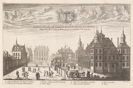 Gravyrens fullständiga titel i svensk översättning: Den vittberömde och utmärkte herr greven och rikskanslern Magnus Gabriel de la Gardies palats i Stockholm från Jacobs kyrka.