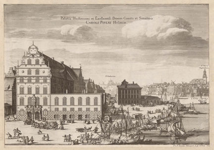 Gravyrens fullständiga titel i svensk översättning: Den lysande och utmärkte herr greven och kungliga rådet Karl Pipers palats i Stockholm.