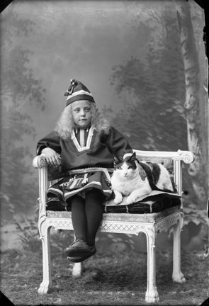 Porträtt av Maja Beckman klädd i samedräkt och tillsammas med en katt.