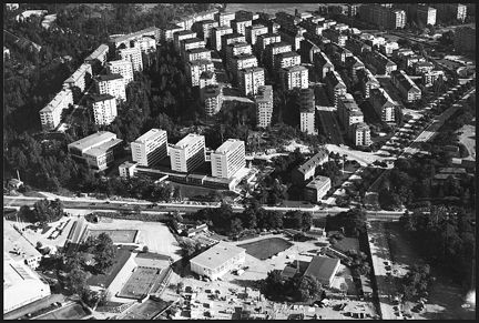 Flygbild över Storängsbotten och Gärdeshöjden. Till höger i bakgrunden Erik Dahlbergsgatan