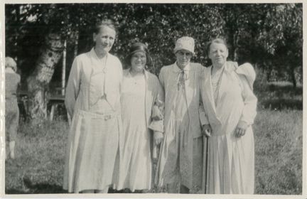 Fotografi av läraren och politikern Ebba Holgersson (första från vänster), pedagogen och rektorn Honorine Hermelin (tredje från vänster) samt läkaren Ada Nilsson (längst till höger) tillsammans med en okänd kvinna taget vid kvinnliga medborgarskolan vid Fogelstad.