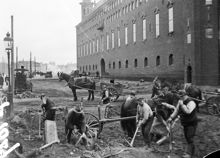 Filmen avslutas med scener filmade på marknivå. Två herrar i hatt betraktar bygget, flera män ansluter, man ser tegelstaplar och arbetar som lossar tegel från pråmar och stuckatörer i arbete med ornament.