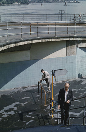 Slussen, Norra Järngraven med trappan, Blå bodarna i bakgrunden. Ovan Norra Slingan