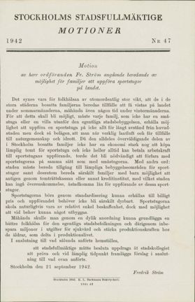 Motion av Fredrik Ström till Stockholms stadsfullmäktige med förslag till åtgärder för att bygga sportstugor på landet för stadsbor.