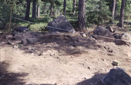 Vid utgrävningen framkom, direkt under torven, ett sotlager som täckte större delen av anläggningen, 5 meter i diameter och 0,5 meter djupt. Det innehöll keramik, bränd lera, flinta, obrända och brända ben samt kol. De brända benen förekom i den SSV delen över ett 1,5 meter stort och 0,5 meter djupt område.