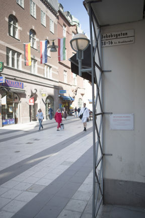 Skylten sitter på Jakobsgatan 18 - på hörnet vid Drottninggatan 10 - och invigdes 1992.