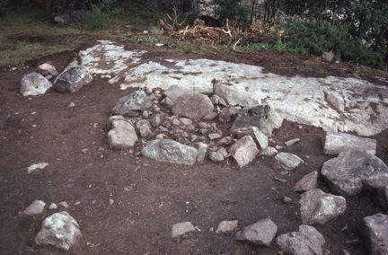 Under den skörbrända stenen framkom ett 0,3-0,4 meter stort och 0,05 meter djupt sotlager. Ovanpå den skörbrända stenen påträffades en keramikskärva, ett bränt ben samt ett fragment av ett förmodat bryne. I sotlagret fanns en mindre mängd kol.