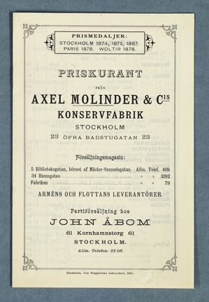 Bilden ovan föreställer en priskurant från Axel Molinder & kompanis konservfabrik.