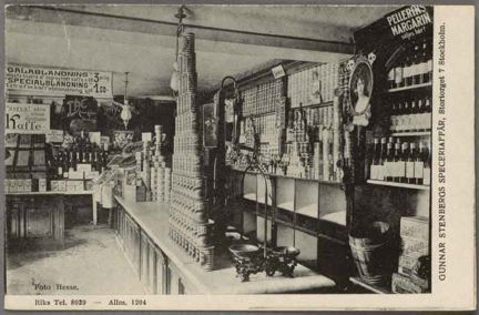 Vykortets motiv föreställer interiör från Gunnar Stenbergs speceriaffär. Speceriaffären sålde matvaror och hade adressen Stortorget 7 i Stockholm. På bilden syns bland annat reklam för margarin och kaffe. Speceriaffärens båda telefonnummer står också på kortet: Rikstelefon 8039 och Allmän telefon 1204.