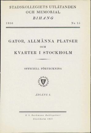 Årgång 4 av den officiella förteckningen över ”Gator, allmänna platser och kvarter i Stockholm” togs fram av Byggnadsnämndens namnberedning 1936 och trycktes 1937.