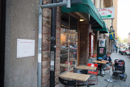 Skylten sitter på fasaden vid Södermannagatan 43 och invigdes 1992.