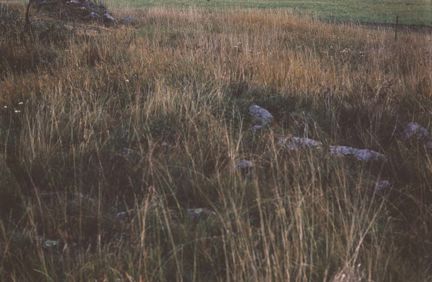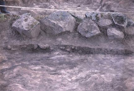 Stensamling, oregelbunden, 4,0 x 5,0 meter stor och 0,5 meter hög med ett 30-tal stora, kantiga stenar av storlek 0,25 x 0,25 - 0,7 x 0,7 meter i ett skikt. Fyllningen bestod av mylla och lerblandad jord mellan stenarna. I östra halvan, 0,6 meter från profilen, framkom en undre småstenspackning, 2,5 x 0,6 x 0,24 meter stor, uppbyggd av ett skikt stenar i storleken 0,1 x 0,1 meter och med fyllning av myllblandad lera och ringa sot.