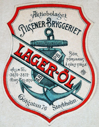 Öletikett tryckt i blått, rött och svart med bild av ett ankare samt text. På etiketten står: Aktiebolaget Pilsener Bryggeriet. Lager-Öl. Götgatan 76 Stockholm. Bör förvaras på svalt ställe.