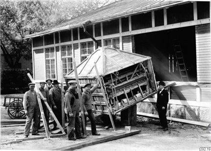 Fotografier som visar män som tar emot en inpackad modell av ett buddisttempel, vid Etnografiska museets dåvarande lokaler i Dragongården på Gärdet.