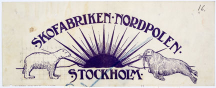 Reklamtryck med sol vid horisont, isbjörn och valross tryckt i lila samt text. Små blyertsanteckningar i vänster sida. På trycket står: Skofabriken Nordpolen. Stockholm.